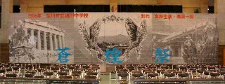 体育館のギャラリーからの展示に限定されるため、大きさは縦4メートル×横14メートルと限られます。去年より、より緻密な作品にしたいという実行委員の熱意で、今年は1センチ四方の紙をモノクロで切り貼りする方法に変更しました。制作自体は、かなり細かく、なかなかやっかいなものでしたが、作業は、休日返上で行われ、蒼煌祭当日は、大きな感動!