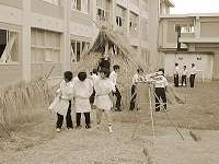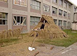 1年生の社会科で学習した縄文人の生活の様子を再現しようというのがクラスのテーマでした。直径は約4.5b、高さ4bという住居で、製作には9時間程度費やしたそうです。本来は萱葺きのところ、材料が手に入らないという理由で藁葺きにしましたが、それでも2トントラックいっぱい分のワラを集めるのには苦労したということです。