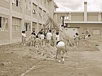 大野市にある陽明中学校が新たな企画で当作品集に参加してくれました。丸太、竹、縄、麻紐、ワラを材料に校庭に再現した竪穴式住居です。