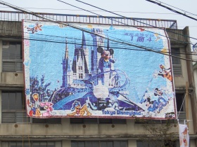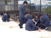 「先生綺麗!!」古い、古い旧第1寮の南側の壁に色鮮やかな"シンデレラ城"が出現しました。文化祭前日午後2時頃、作品が吊り下げられた直後、女子生徒の多くが歓声を上げながら、携帯のカメラで一生懸命モザイクアートシンデレラ城を撮っていました。作品の吊り下げに係っていた生徒たちは、担任の合図で階段を駆け降り自分たちが心をこめて創り上げた素敵な作品を穴の開くほど見続けていました。