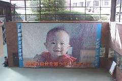 京都市にある京都橘女子高校の文化祭に登場した壁画は、赤ちゃんの写真でした。同校では全校自治の中核となる「生徒会執行部」と、学年ごとの「学年委員会」がそれぞれ連携をとりながら自主活動を行っていて、今回は三年生の学年企画として、このモザイク壁画が生まれました。最近の文化祭でも、アフリカ問題を考える中で地球規模の行動を考えた「アフリカ企画」、子供たちの夢がいっぱい詰まった「子供の国企画」、それまでの紙すきの授業を生かした「牛乳パック再生企画」、車いすバスケットの招待試合を通して障害者との共生を考えた「車いす企画」など、とても充実した発表がなされている学校です。そんな中で三年生にとって最後となる学園祭企画がこの作品でした。
