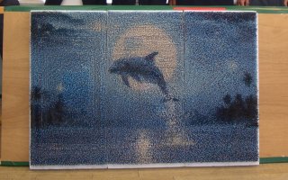 太成学院大学高等学校1年1組ではクリスチャンラッセン氏の「Leap of Faith」という作品を爪楊枝点描画で表現しました。爪楊枝の色づけ作業に時間がかかってしまった上、作品の制作規模の関係上0.5mm間隔で爪楊枝を挿していったため、作業効率が悪く非常に苦労しました。しかし完成したときの感動は大きく、文化祭来場者の方々をはじめ多くの方々から賛辞をいただきました。文化祭終了後は学校の玄関ホールに展示していただけることになりました。