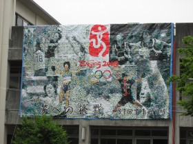 1年7組40名が力を合わせ、約2週間で縦5.4m×横8.5mのモザイク画を仕上げました。テーマは北京オリンピック。日本のアスリートたちの活躍を祈り、「夢への挑戦」と名づけました。原画はカラー写真を組み合わせたものですが、一部モノクロ処理をし、北京オリンピックのロゴマークをカラーで際立たせています。