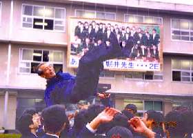 当日、この巨大壁画が大盛況であったことは言うまでもありませんが、堀井先生もたいそう喜ばれ、胴上げをされて半泣き状態。記念に写真を額に入れてクラスからプレゼントされたということです。素晴らしい作品ですね。