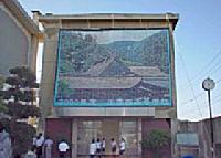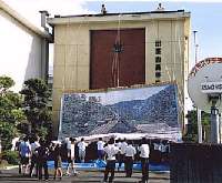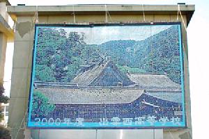 島根県にある私立出雲西高等学校の校舎壁面に発表された作品は出雲のシンボルでもある「出雲大社」でした。体育大会の保護者観覧用の企画として制作されたということですが、地元でも大評判になり一日延長して展示されたということです。当日は、体育大会があるため、早朝6時からの展示作業となりました。出来栄えは想像よりもはるかにきれいで、その巨大で精巧な作品に目を奪われました。マスコミ各社の報道も手伝い、盛況により、翌日午後までの延長展示披露となりました。目的の通り、生徒と教員が『感動』する企画となりました。