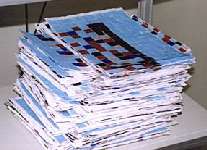 ・購入した色紙を2.5センチ四方に切断作業。しかし、この作業が以外にも時間を要してしまった。生徒にさせればよいのであるが、さすがに8万枚にも及ぶものを、はさみでは不可能と考え、学校の裁断機を利用しての作業にした。この作業だけで、1週間を費やした。