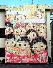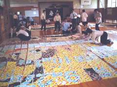文化祭前日は雨で、剣道場での作業になりなしたが、なんとか一枚の壁画になったときには歓声がおこりました。またこの時に、山陽新聞、読売新聞からも取材を受け、翌日の朝刊に写真入りで掲載されました。