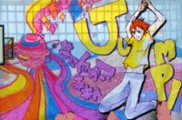 津山西中学校の壁画は生徒が描いた原画を元に制作されています。同校ではモザイク壁画はパネルと呼んで文化祭での演劇の背景にも用いられます。
