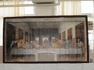 私たち呉宮原高校1年3組ではみんなで写真をとり、それを利用してひとつの大きな絵を組み立てるという「フォトモザイク」を作成しました。モザイク作成ソフトで原画を作成し、それに基づいて素材となる写真を貼り付けていき、合計3万枚の写真を使い、縦約1.5メートル、横約2.6メートルの絵を完成させました。貼り付け作業は本当に大変でしたが、完成したときには見事な絵が浮かび上がってきて、感動しました。