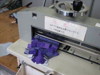 2.5cm片のいろがみにカットするのだが、学校の裁断機では縦が上手くカットして短冊上にまでできても、それを90度回転させて横をカットすることが難しい。ちょうど機械の小さな溝にはまったり、横や後ろから用紙が曲がらないように支えるガイドがこのサイズに対応していないからです。カットする前に周囲の耳の部分をセロハンテープでとめて直方体のブロックにしてから裁断機にかけたら多少のズレは防止できました。(セロテープは縦方向だけで直ぐ剥がれてしまうこともありましたが)